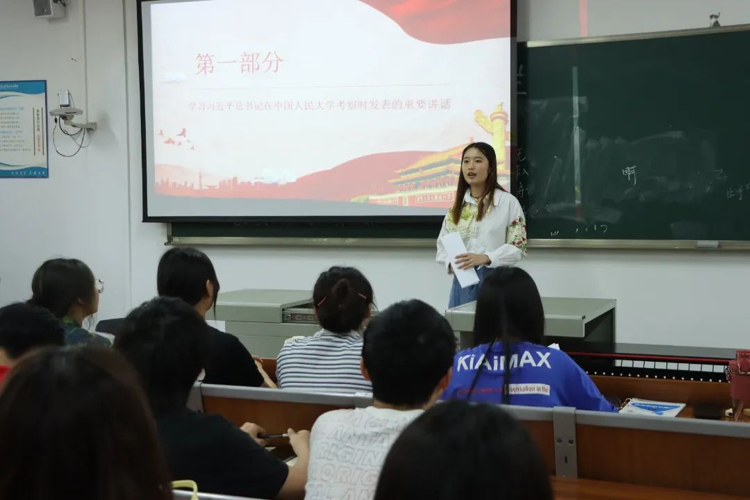 接着,由赵萍鑫同学主持开展“弘扬五四精神 奉献火热青春”主题教育。她向同学们讲解了五四运动含义和意义,并对五四精神时代内涵进行讲解。最后她强调,各团支书在团课中应加入习近平总书记在中国人民大学考察时发表的重要讲话的内容并了解五四精神时代内涵。