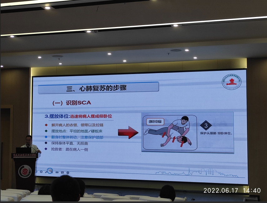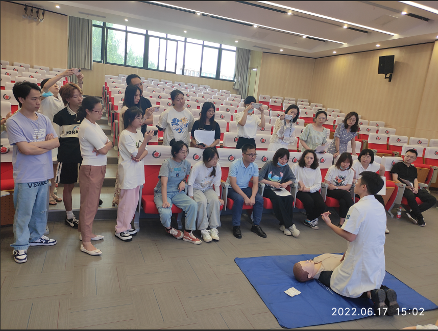 彭涛医生在师生线上学习的基础上,结合案例讲解了急救知识的必要性,并详细讲解了120急救电话拨打方法、现代心肺复苏、气道异物梗阻急救方法以及在中暑和溺水情况下的急救知识。为了使师生初步掌握实操技能,毛国合医生进行了现场示范与演示。