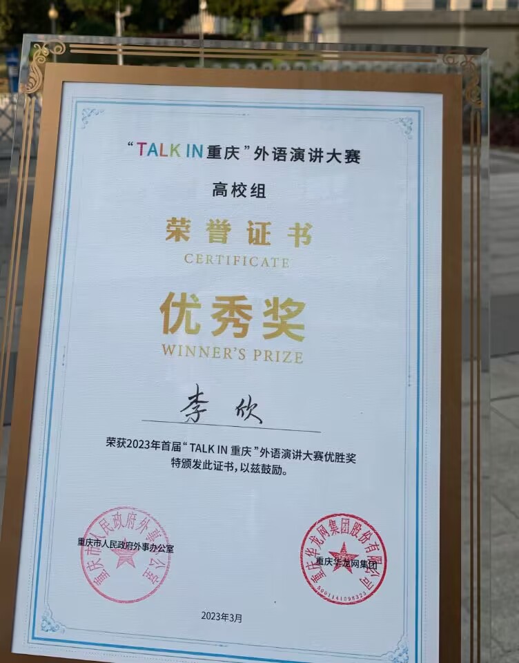 2022年3月,由重庆市人民政府外事办公室与重庆华龙网集团联合主办的@重庆@世界·首届"TALK IN 重庆"外语演讲大赛顺利进行,自大赛启动以来,获得了社会各界的广泛关注,来自高校、医疗、教育、外贸、金融、文化等领域的选手踊跃参与,共有265名选手报名参赛。其中,重庆文化艺术职业学院学生李欣在首届“TALK IN 重庆”外语演讲大赛中获高校组优秀奖。