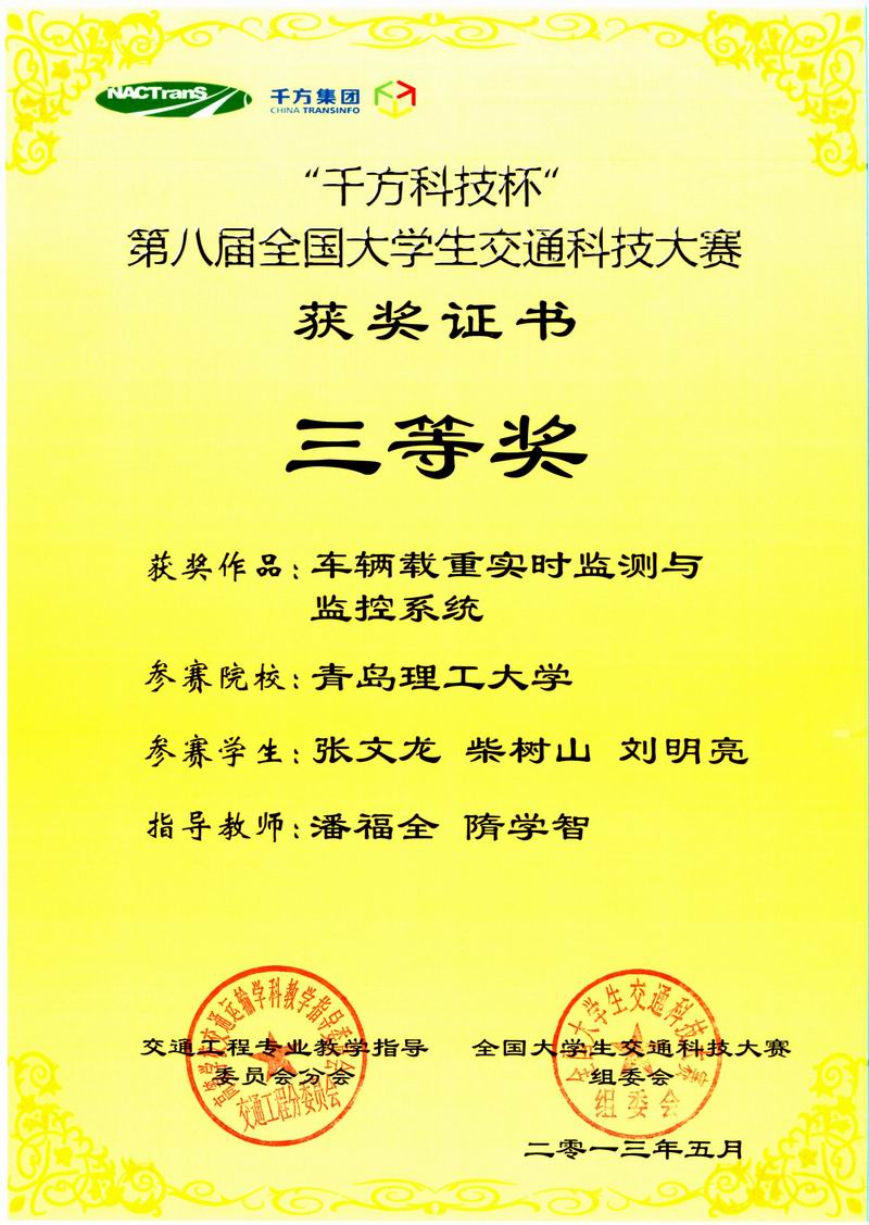 5月25日至26日,由教育部高等学校交通运输与工程学科教学指导委员会主办、北京工业大学承办,以“顺畅交通”为主题的第八届全国大学生交通科技大赛决赛在北京举行。本届大赛共有全国86所大学报名,198件作品参加选拔,经过专家组评审,仅有来自51所学校的80件作品进入决赛。kaiyun官网由潘福全、隋学智老师指导,张文龙、柴树山、刘明亮同学合作完成的《车辆载重实时监测与监控系统》荣获三等奖。
