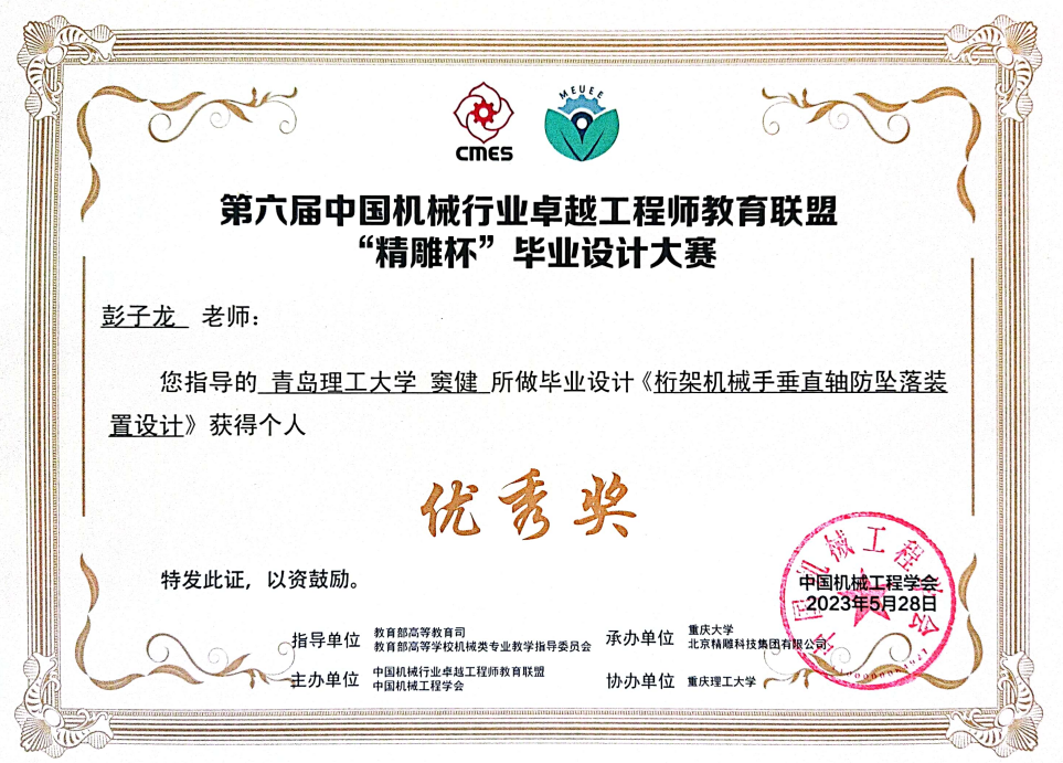 此次“精雕杯”毕业设计大赛,学校共申报参赛13个项目,共获得中南部赛区二等奖1项,三等奖4项。其中来自青岛理工大学-潍柴现代产业学院的参赛作品“桁架机械手垂直轴防坠落装置设计”获得中南部赛区二等奖,晋级决赛(学生:窦健,指导教师:彭子龙、大国工匠王树军、杨德仁)。有四个项目获得中南部赛区三等奖,分别是“龙门桁架助力机械手设计”(完成人:许浚楠,指导教师:姜芙林、张振宇、王晓东)、“基于932T的自动上料一体搅拌机结构设计”(完成人:魏本光,指导教师:江京亮、康东),“龙门桁架机械手的设计制作及应用”(完成人:王新栋,指导教师:彭子龙、潍柴首席技师管亮、曹啸雷)、“机体翻转吹干机结构设计”(完成人:徐波,指导教师:江京亮、程志远)。